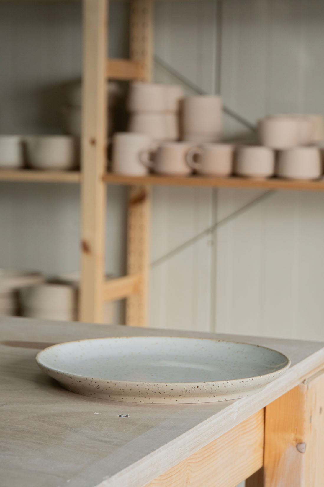 Hand-thrown plate made out of speckled stoneware and glazed in a glossy white glaze. Great for family dinners.