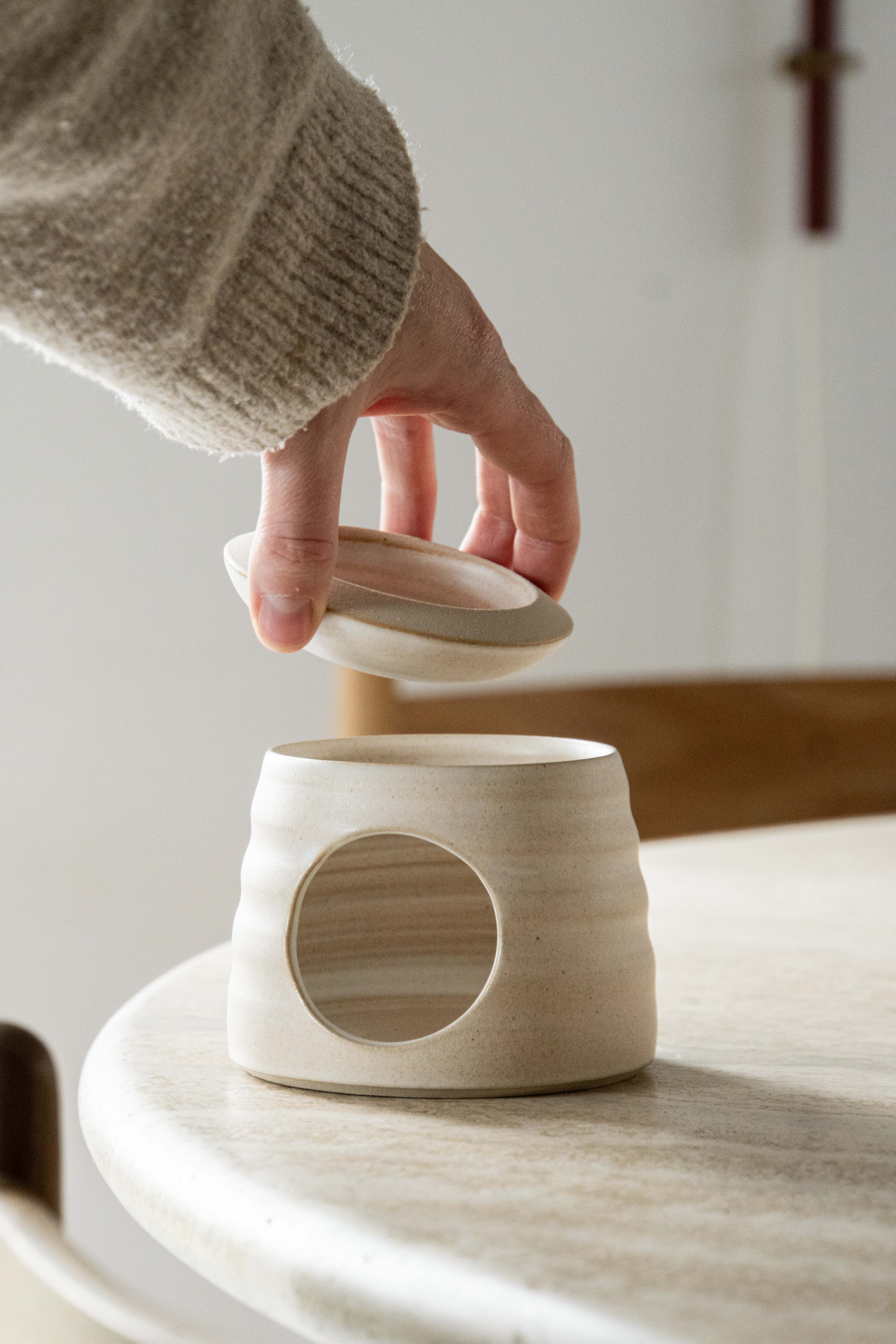 Hand-thrown oil burner made out of white speckled clay and glazed with a satin beige glaze.