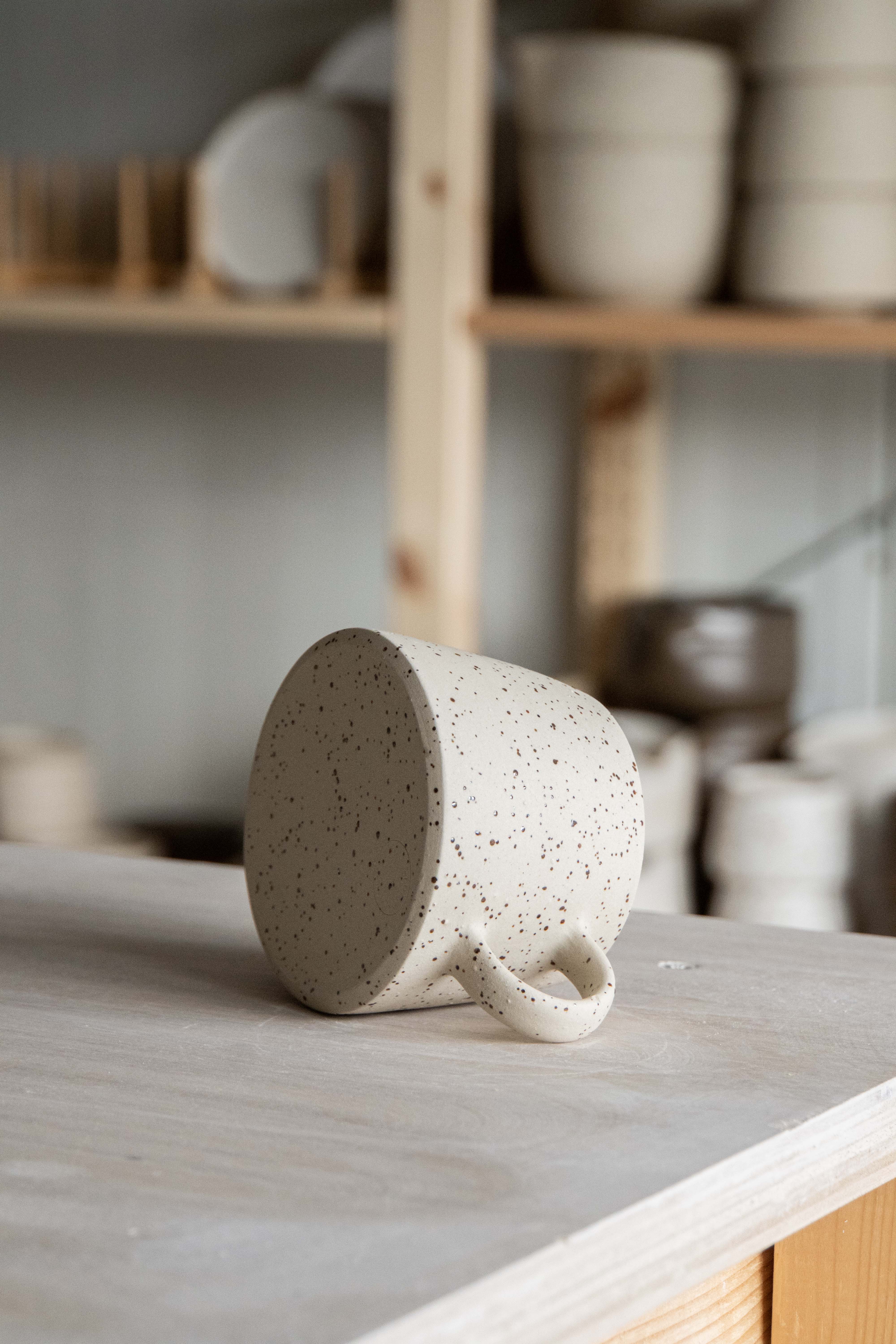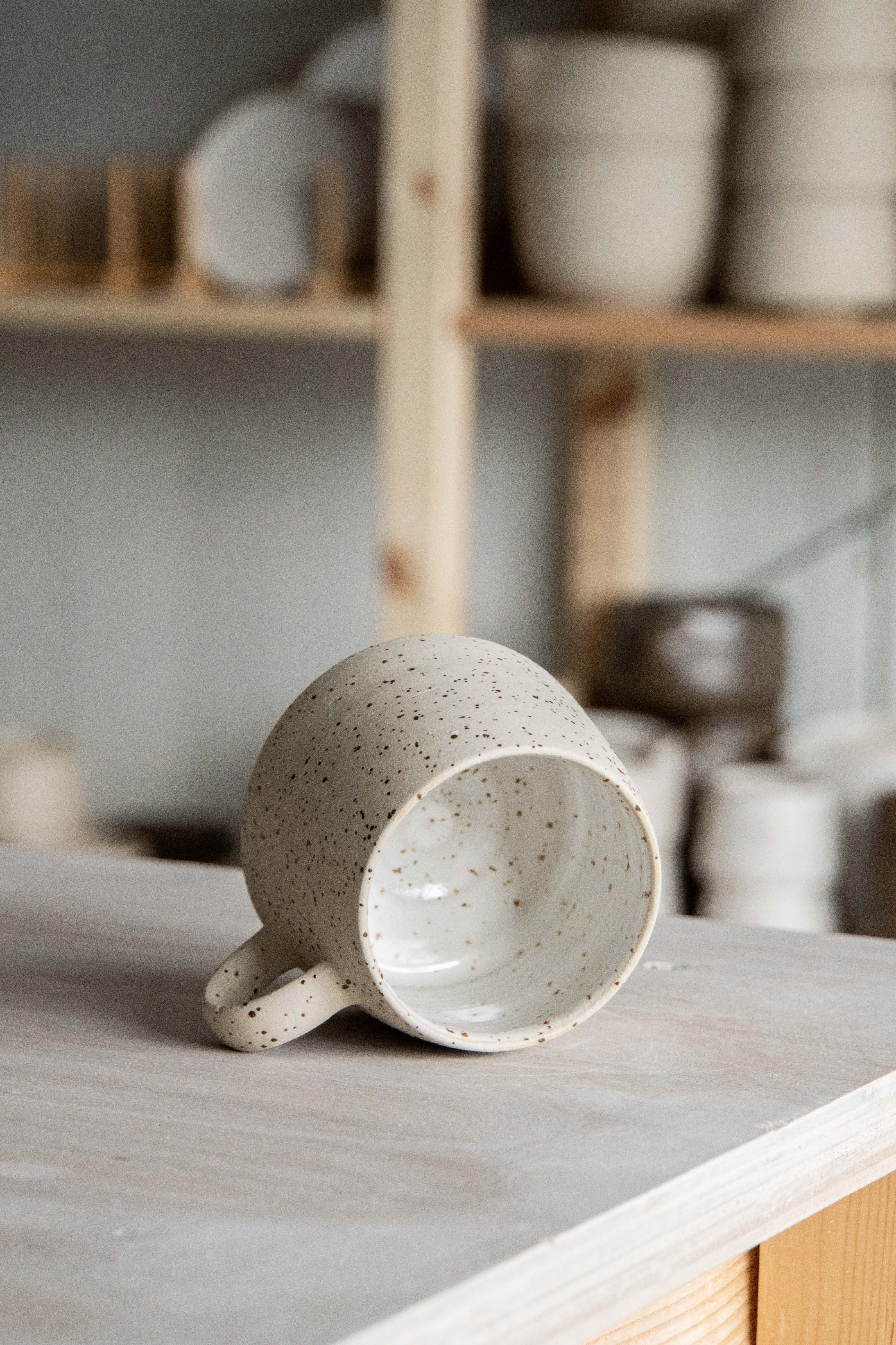 Hand-thrown mug made out of white speckled stoneware and glazed on the inside with a glossy white glaze. Great for coffee, cappuccino and or a small tea.
