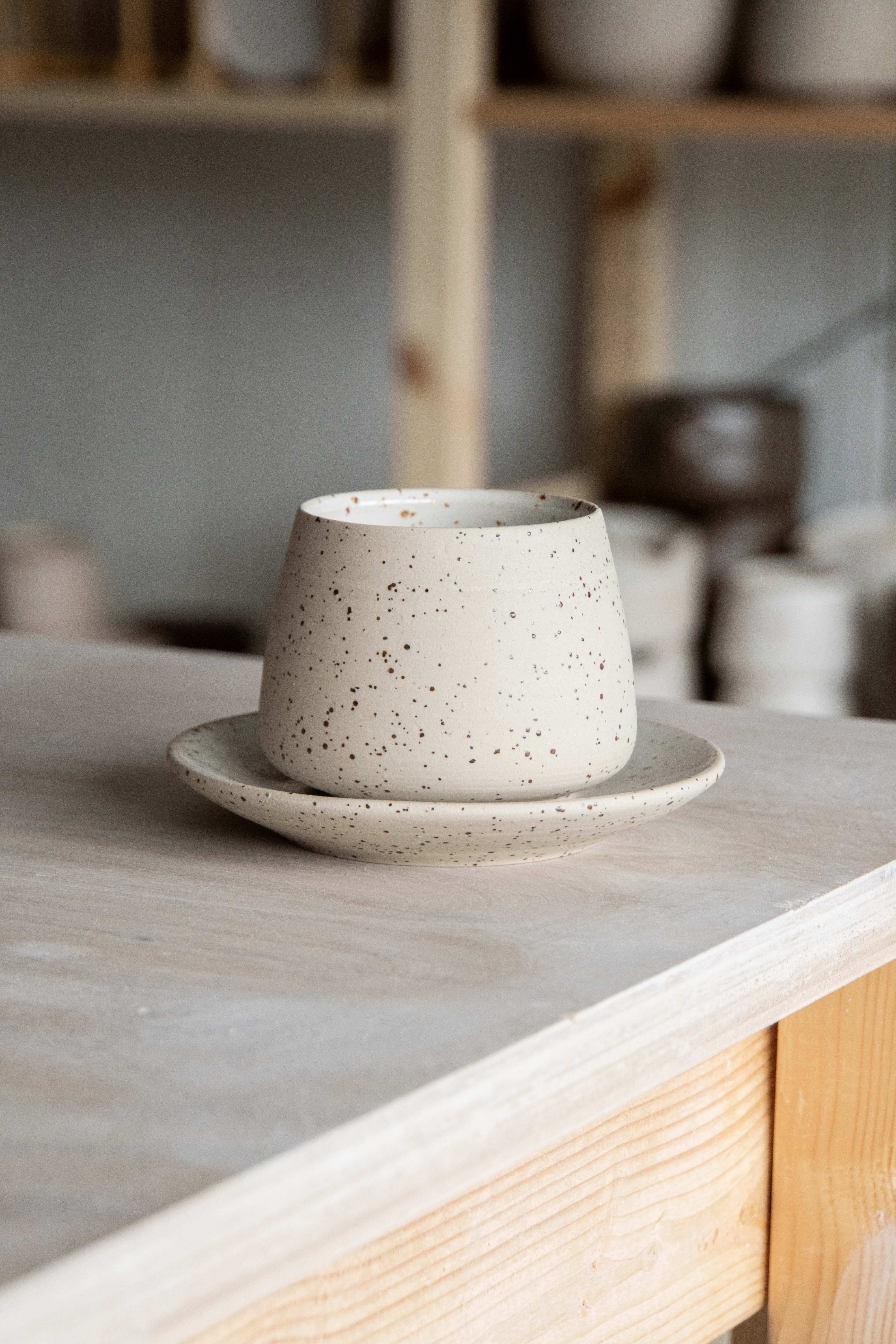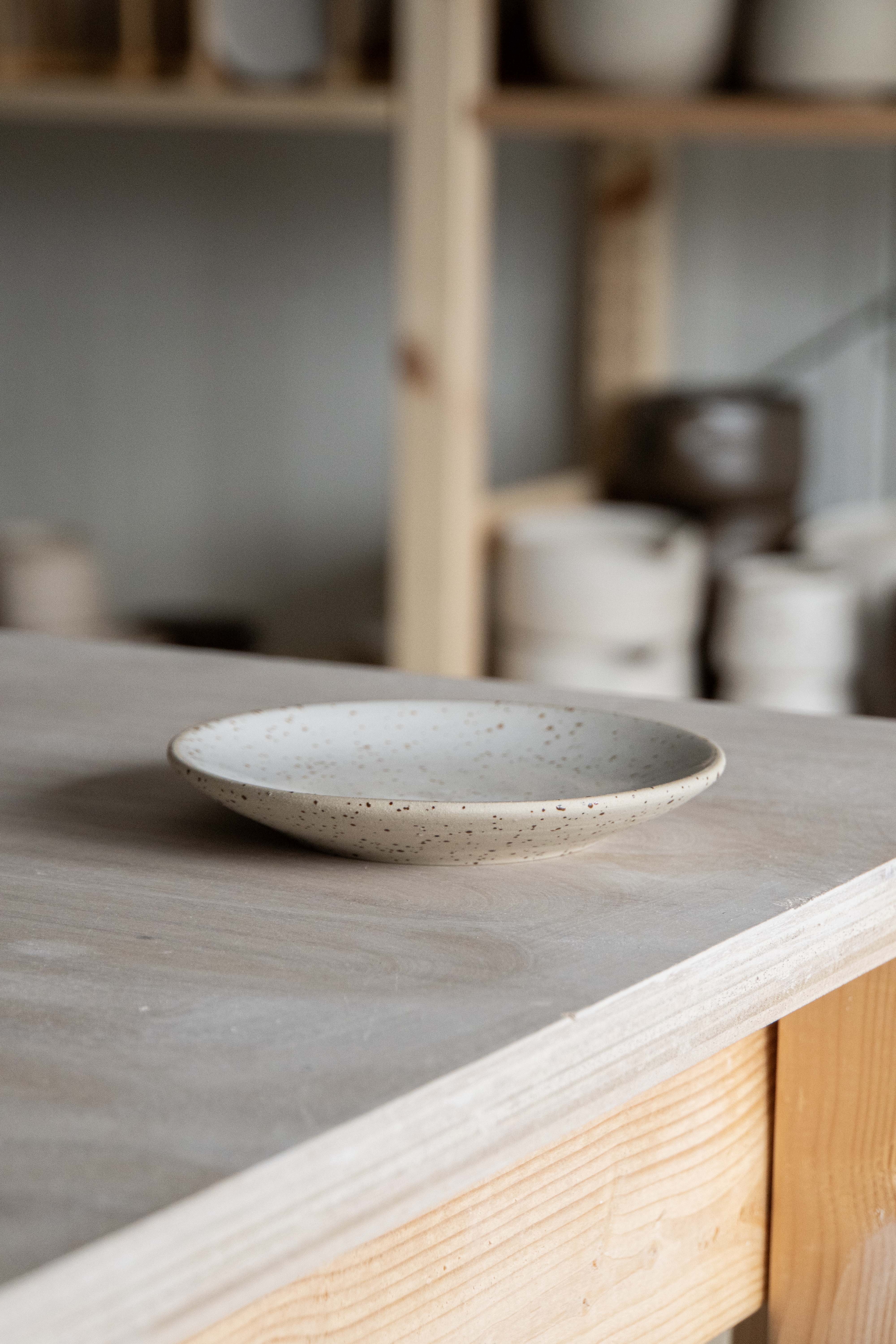 Hand-thrown saucer made out of white speckled stoneware and glazed in a glossy white glaze. Great to pair with the Serif Cup Round.