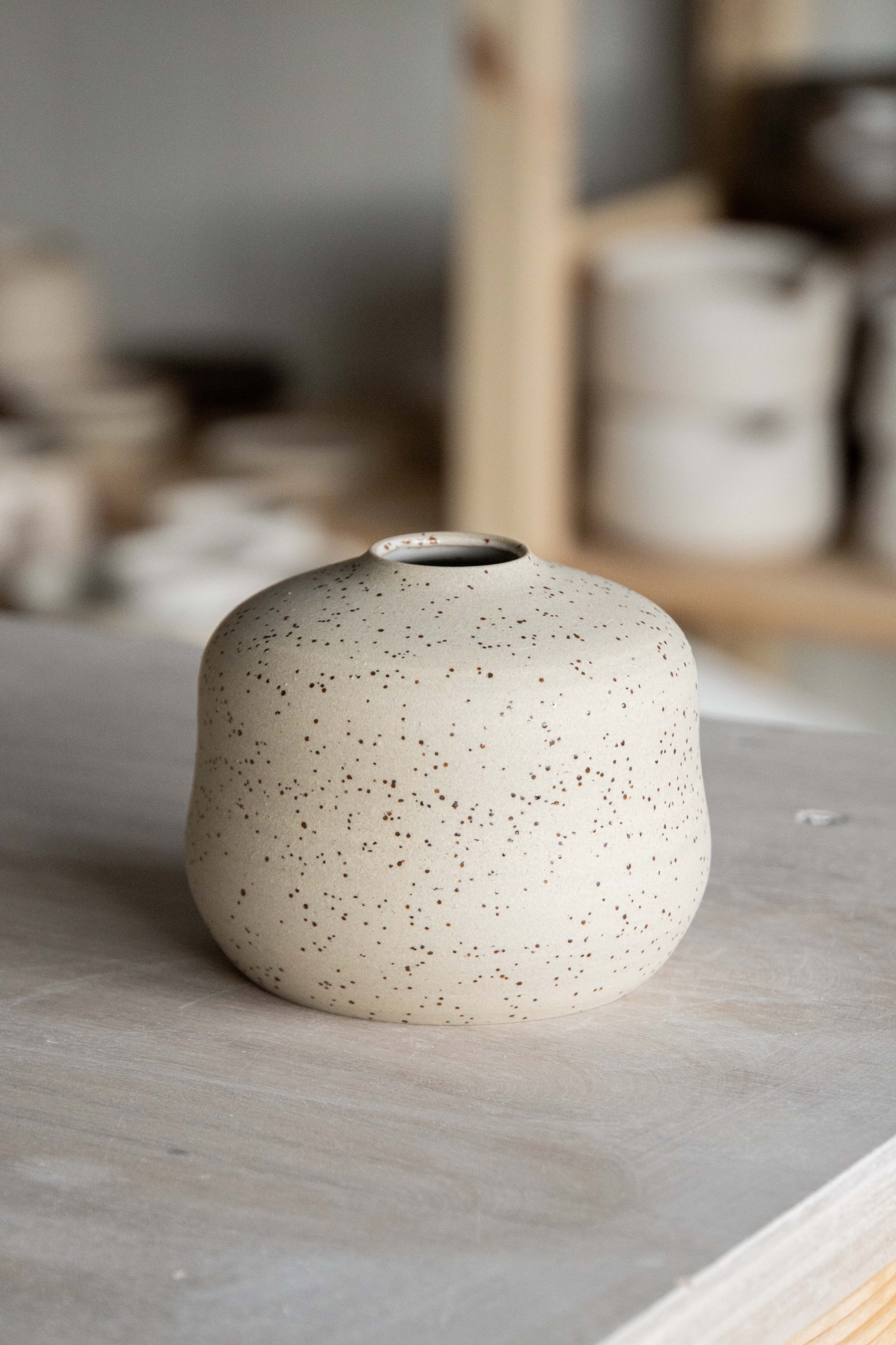 Made with speckled clay and glazed with a glossy clear glaze on the inside.