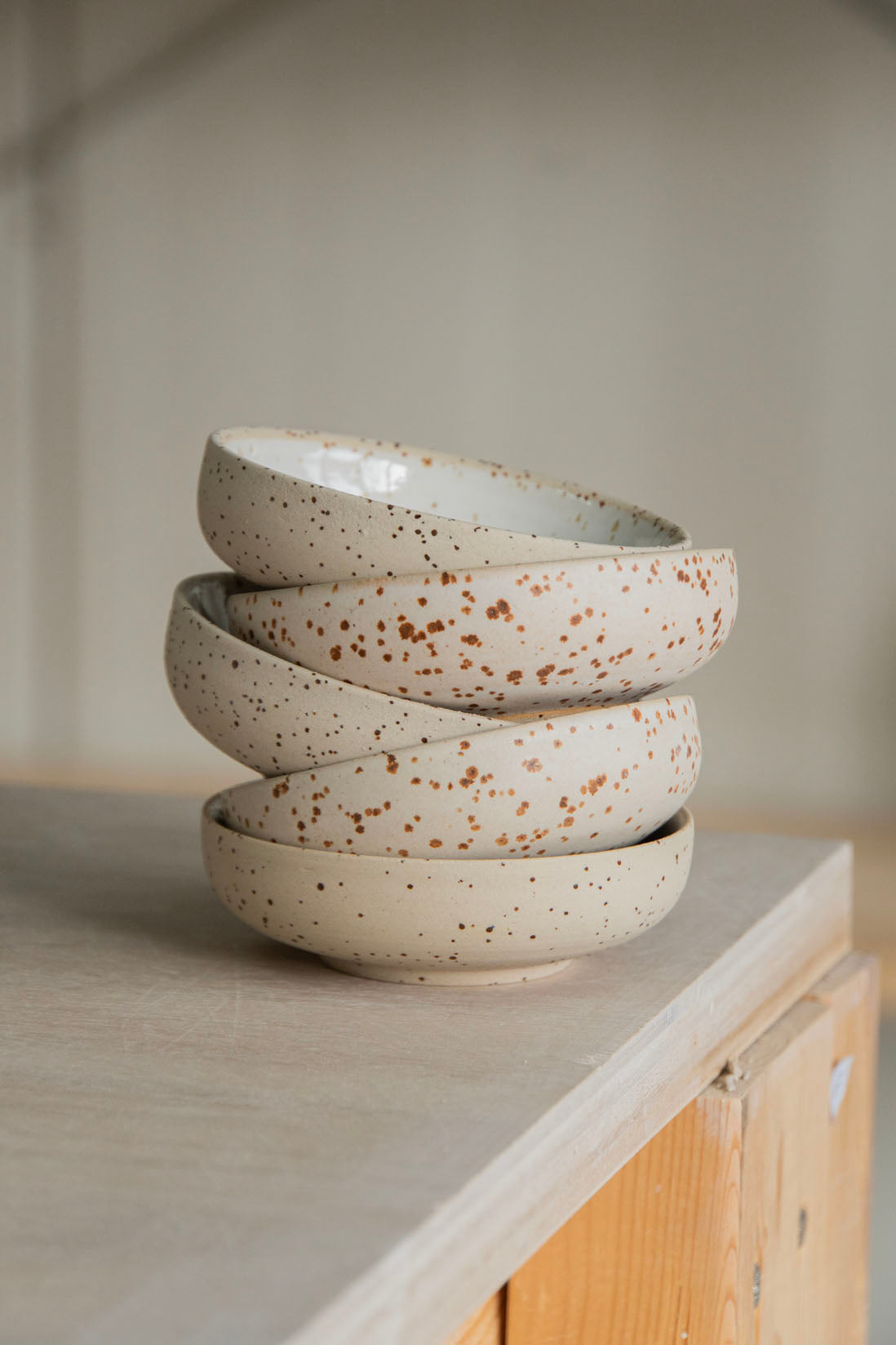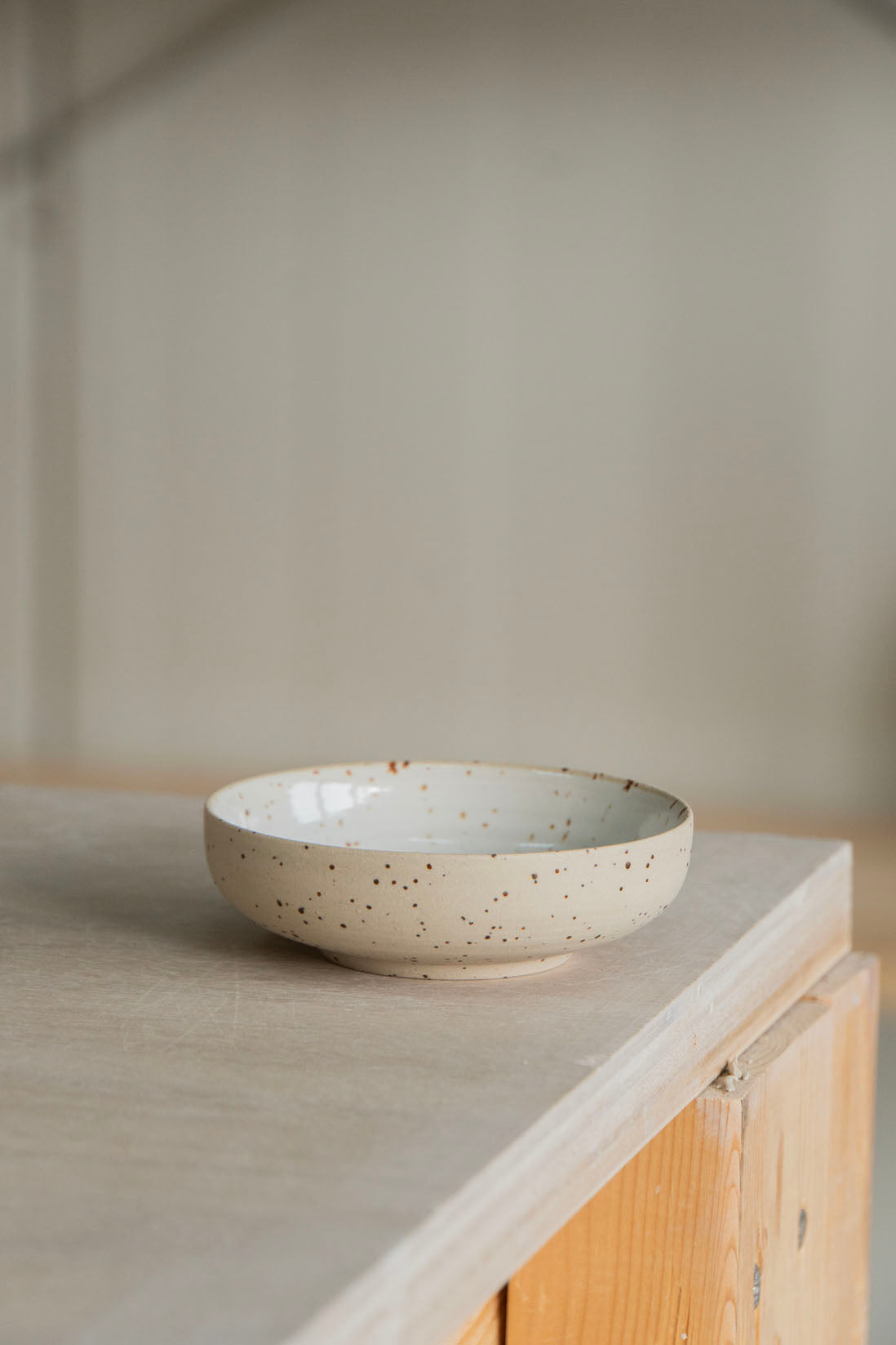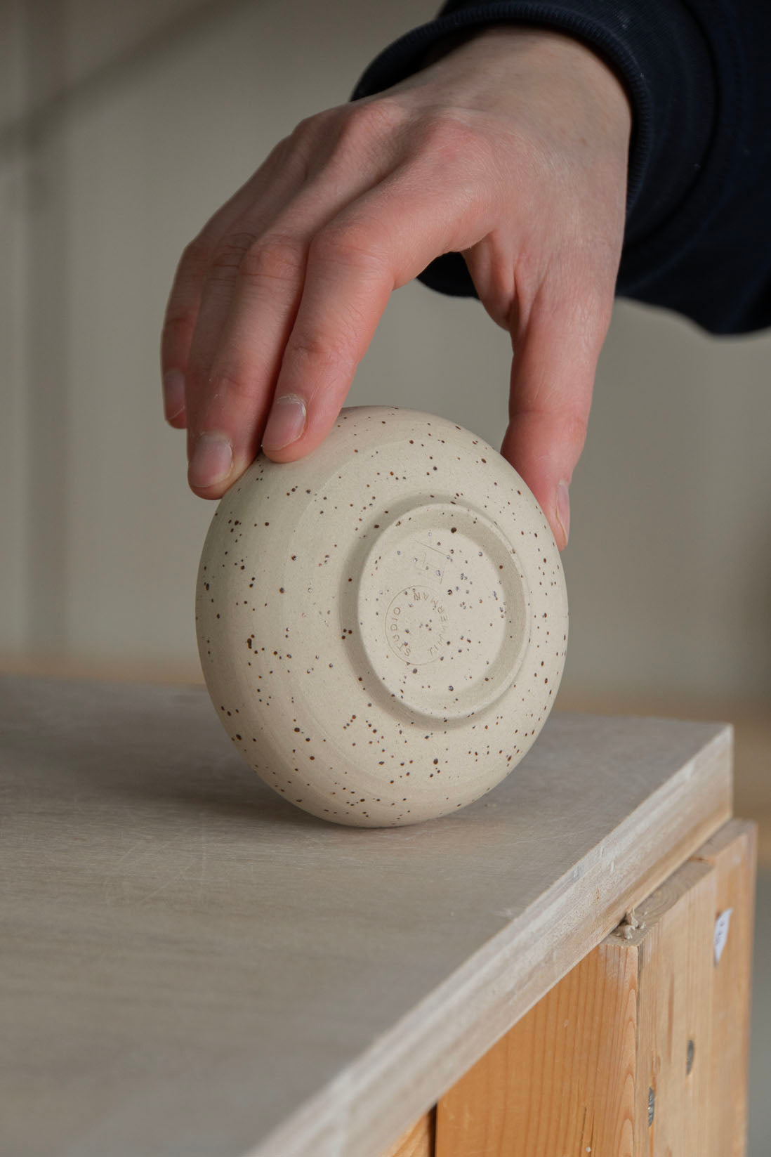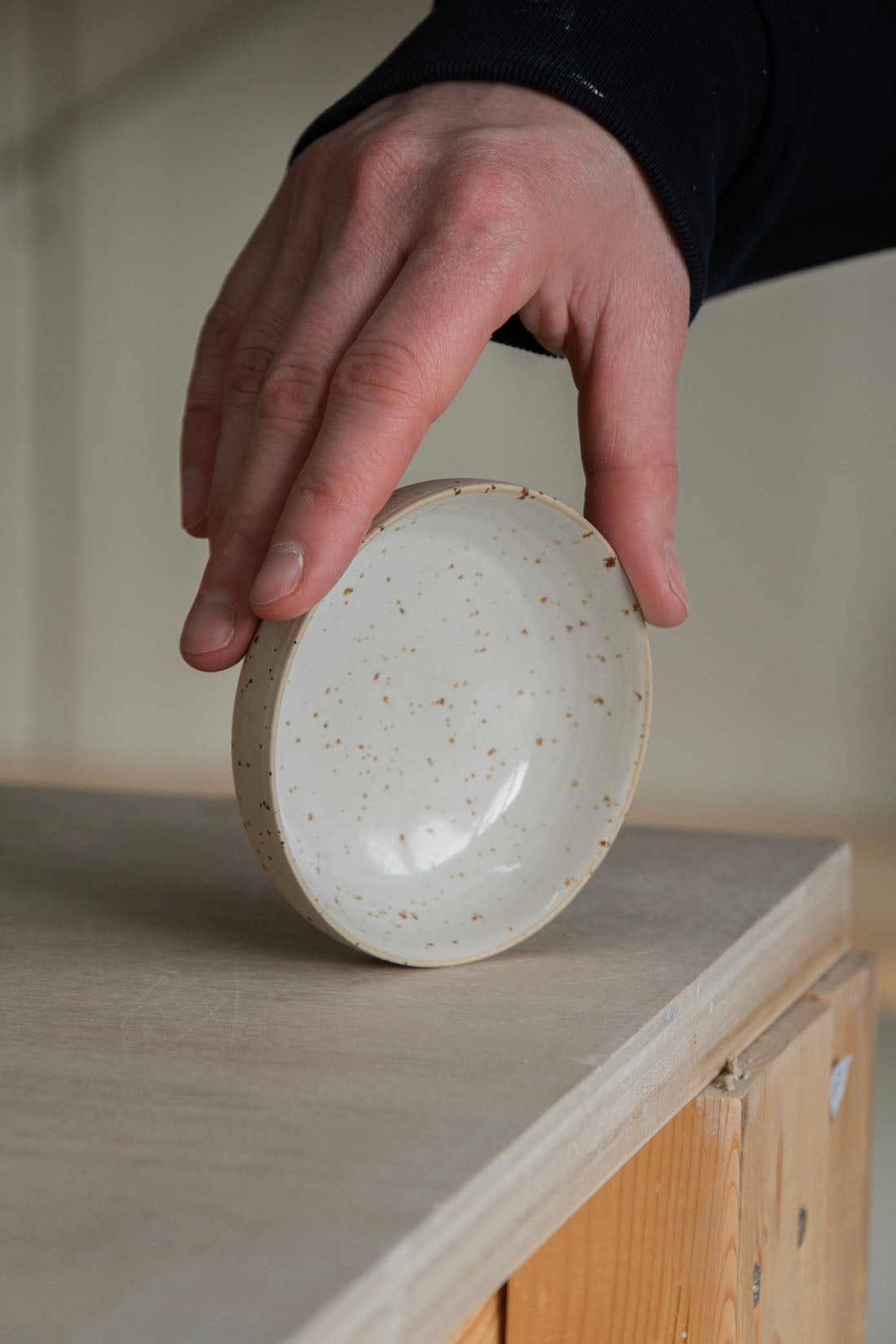 Bol fait à la main en grès moucheté et émaillé d'un blanc brillant. Idéal pour un sachet de thé et votre sauce préférée.