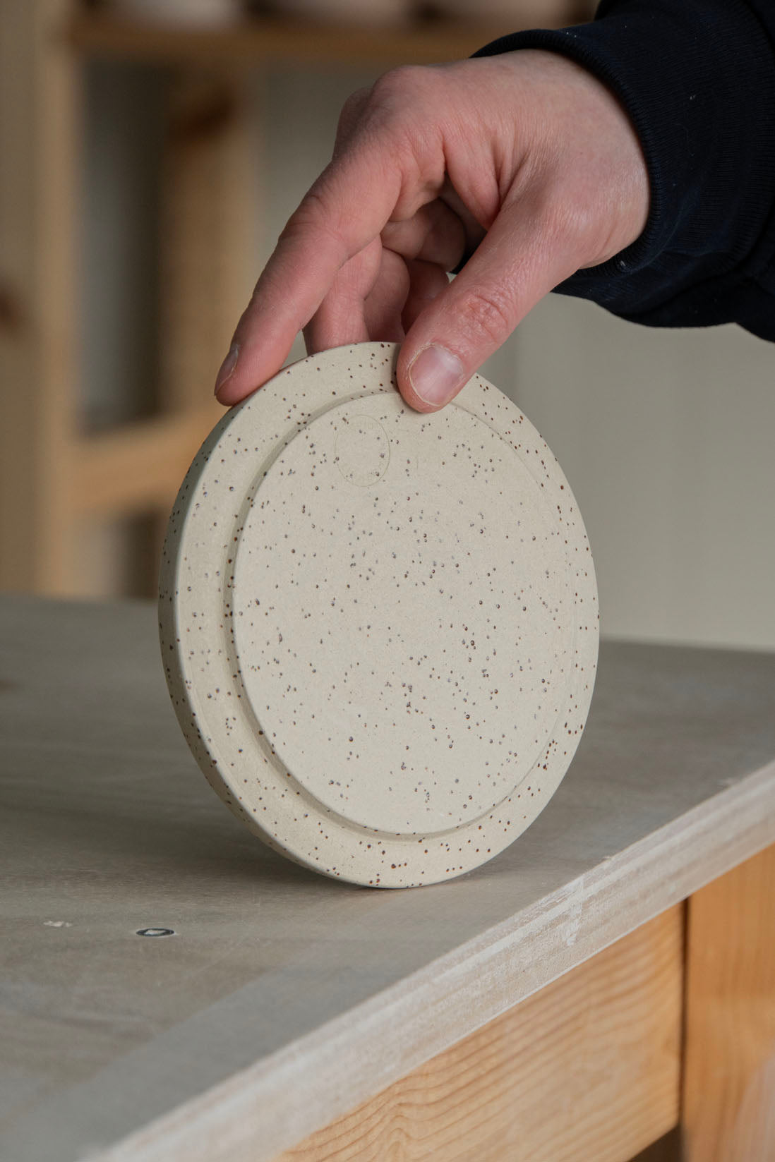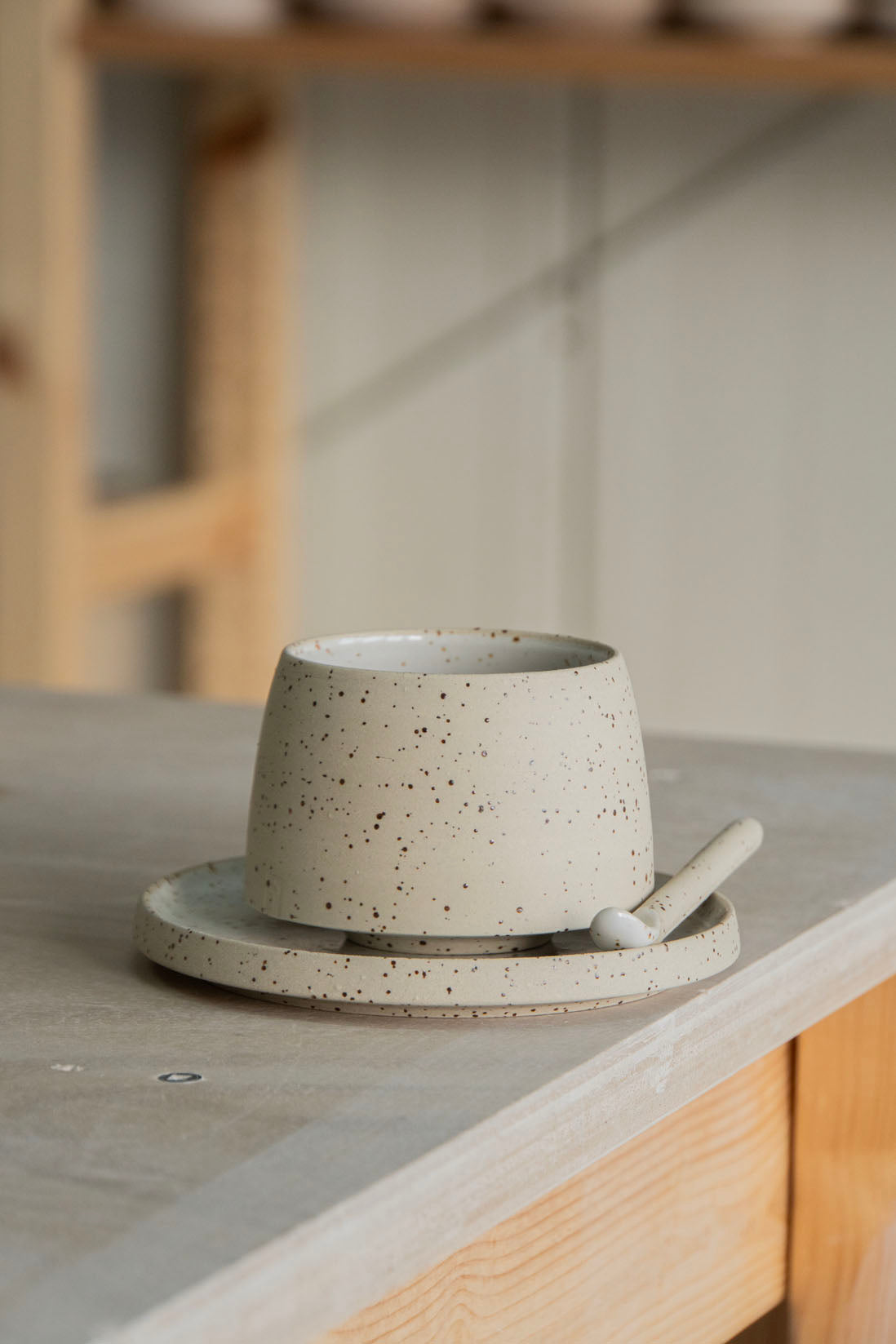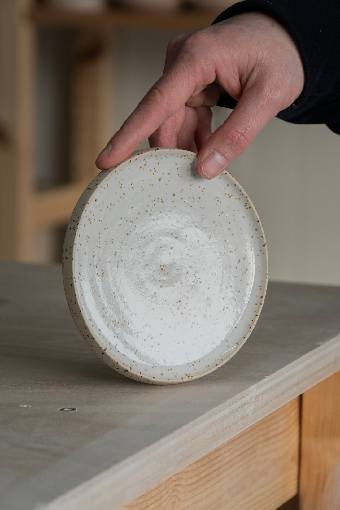 Assiette faite à la main en grès moucheté et émaillée d'un vernis blanc brillant. Idéale pour un morceau de gâteau ou votre tasse à café Serif.